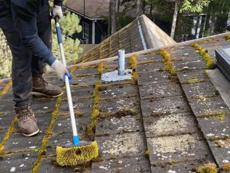 - A long-handled brush is advantageous for removing stubborn patches of moss once the roof is clear.